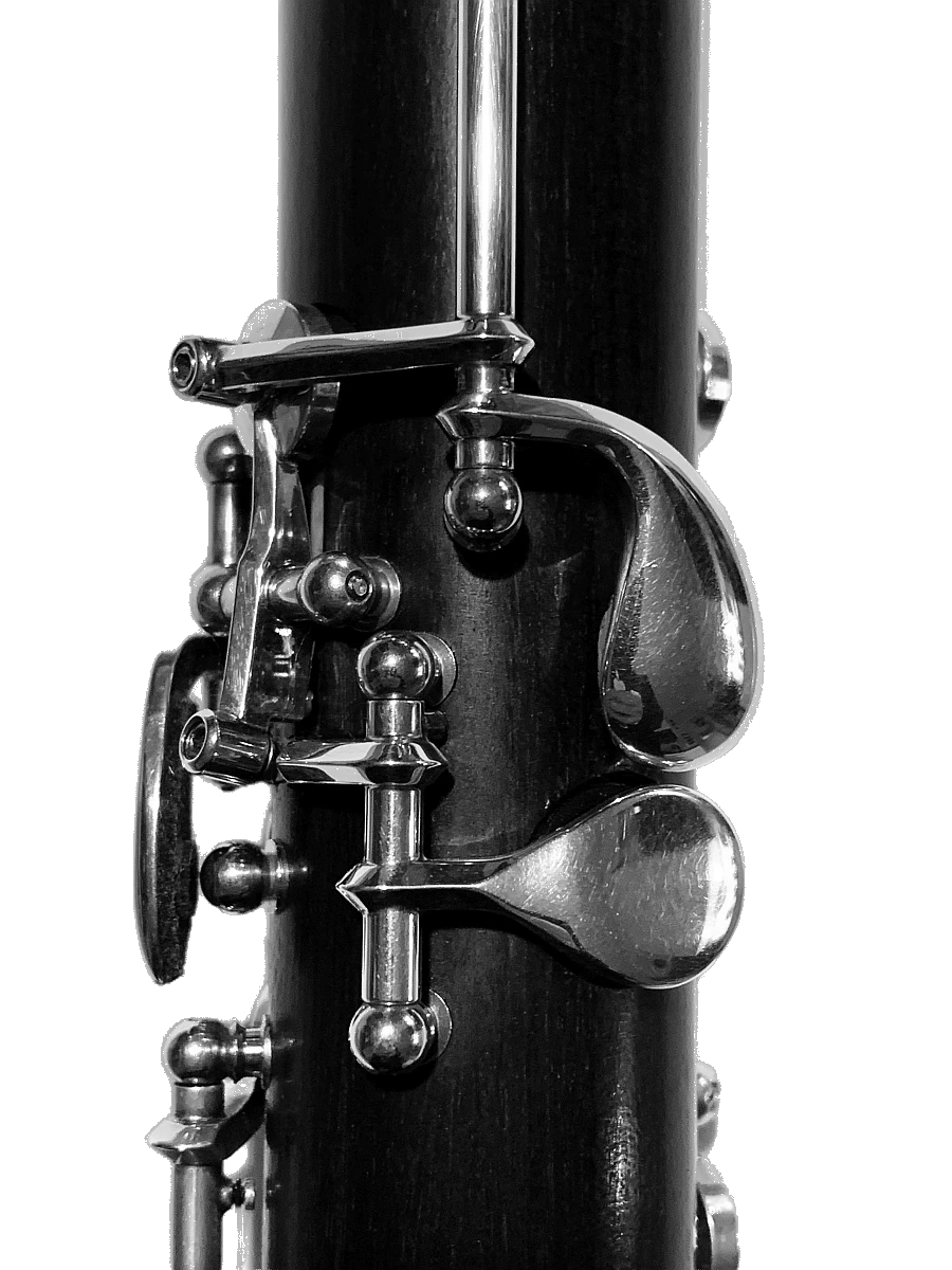 Freilich ist die b'-Mechanik keine Erfindung des frühen 21. Jahrhunderts. Instrumentenbauer, die sie heute wieder verbauen, greifen bewusst auf bekannte Vorbilder aus dem 20. Jahrhundert zurück. Insofern ist die b'-Mechanik heute keine Innovation, sondern Wiederentdeckung und Weiterentwicklung zugleich. Die beiden folgenden Fotos zeigen eine 2016 bei Schwenk & Seggelke (jetzt: Seggelke Klarinetten) in Bamberg gefertigte b‘-Mechanik nach ihrem historischen Vorbild der Schmidt-Kolbe-Klarinetten aus den 1920er/30er-Jahren.